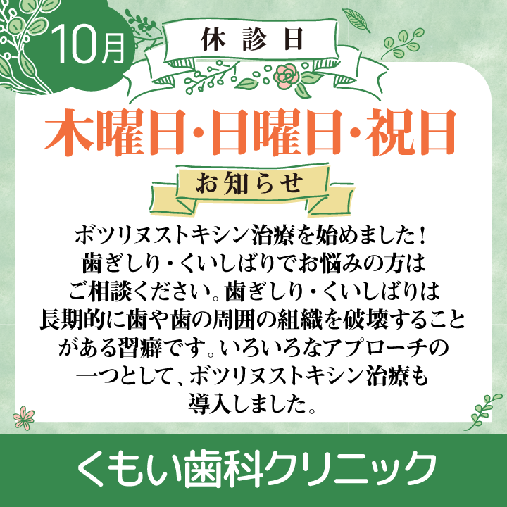10月休診日情報【二子新地のくもい歯科】